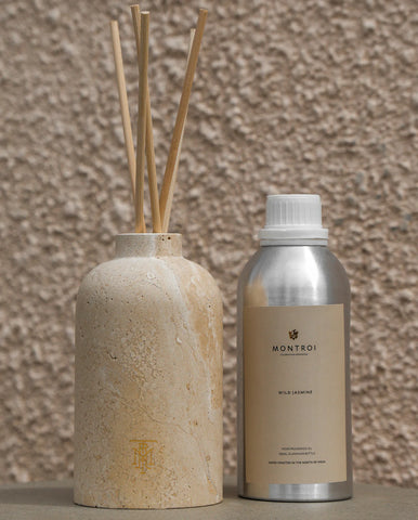 Inspired by the structures within the Shaki Caravanserai's corridors, the Shaki reed diffuser serves as a silent witness to the vibrant history of the Silk Road. Its weathered facades echo tales of commerce and cultural exchange.Hand-crafted from solid travertine sourced from Turkey, a team of five skilled artisans dedicates four days to perfectly curate, design, and shape each element from two kilograms of marble, ensuring that each piece is unique. From the excavation of raw materials to the carving and polishing of finished pieces, each step in the process is a labor of love that transforms stone into a timeless work of art.