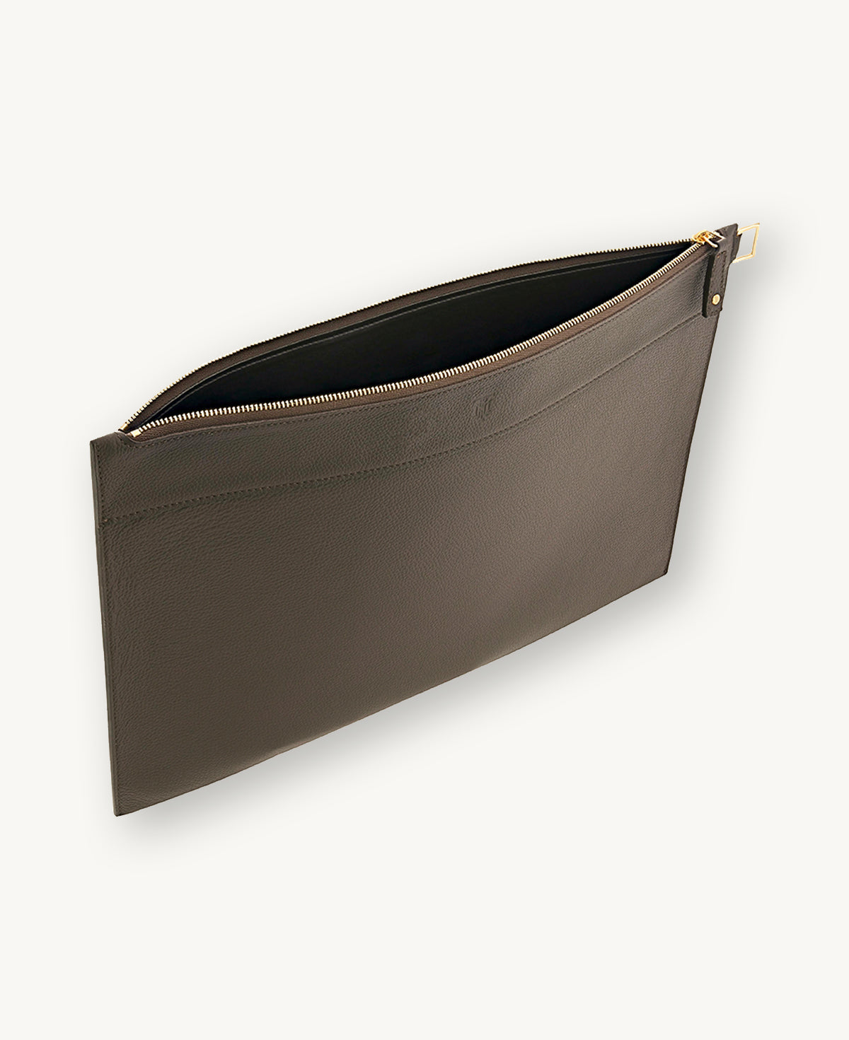 LEATHER POUCH LARGE is handcrafted from Tunisian calf grain leather. This design makes the pouch very resistant and becomes more beautiful with age. LEATHER POUCH LARGE protects small items when travelling, it fits a mobile phone, a tablet, passport and all essential travel documents inside and in the outside pocket.